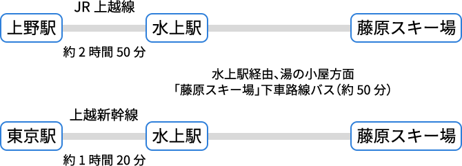 藤原スキー場は日帰り旅行にもおススメ。車でお越しの場合はもちろん、藤原スキー場行きの路線バスがあるので、新幹線を使えば都内からも日帰りできます。