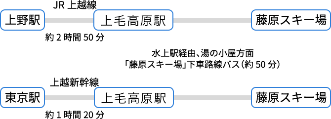 藤原スキー場は日帰り旅行にもおススメ。車でお越しの場合はもちろん、藤原スキー場行きの路線バスがあるので、新幹線を使えば都内からも日帰りできます。