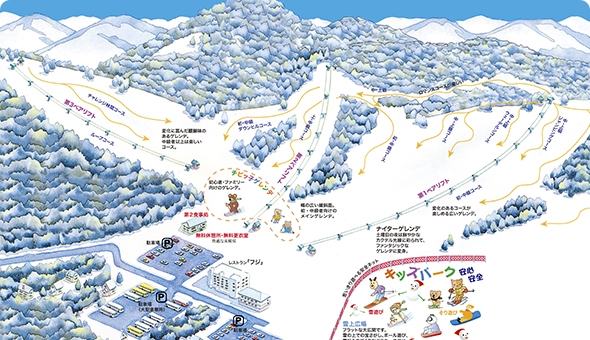 藤原スキー場はコースの半分以上が初級~中級者向けと、比較的ゆるやかで広々とした横幅のコースで設計されています。