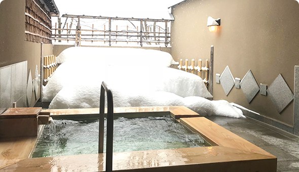 ホテルサンバードに宿泊される方には個室の貸切露天風呂をご利用いただけます。酒樽のお風呂や陶器でできたお風呂など個性豊かな11種類の露天風呂をご用意。雪を見ながら触れながら温泉をお楽しみください。