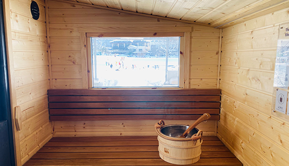 スキー場内で本格サウナを楽しめます!熱々になった後は、フワフワのパウダースノーにダイブ。ゲレンデを見渡しながらの外気浴でととのうこと間違いなし